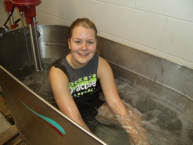 Mijn blog deed een tijdje raar, maar ik hoop dat hij het nu weer doet.. Ik weet het niet zeker dus we zullen zien .. :) Met basketball gaat het wel goed.. van de afgelopen vier wedstrijden wonnen we er drie, dus we doen het beter als met volleyball.. Ik heb dr ook wel lol in.. dus das wel chill :) wel heel erg spijtig is dat ik naar de soort van fysiotherapeut van school ben geweest want ik heb dus twee spieren in mn linkerbeen erg overrekt ofzo.. dus ik loop hier nu te rekken en strekken als een malle. Soms word ik ook midden in de nacht wakker omdat het bewegen van mn benen, en de pijn die dat geeft me wakker maakt. Een van de dingen die ik moest doen die het beter zou maken was, voor trainen in een heet water whirlpool moest zitten, dit was rond de 40 graden Celsius, opzich wel relaxed, nadeel was dat ik na trainen, super warm en bezweet in een tien graden warm whirlpool moest zitten.. dat was hel! Omg.. echt superkoud.. Ze stopten dr zelfs allemaal blokken ijs in! Mn aardige duitse andere exchange student mattie heeft foto’s gemaakt van mij in de whirlpool. Wel moet ik erbij zeggen dat deze is gemaakt in de warme bad, vandaar dat ik nog een redelijk normaal gezicht erbij kan zetten.. niet dat het een mooie foto is hoor.. want erg sexy is het niet..